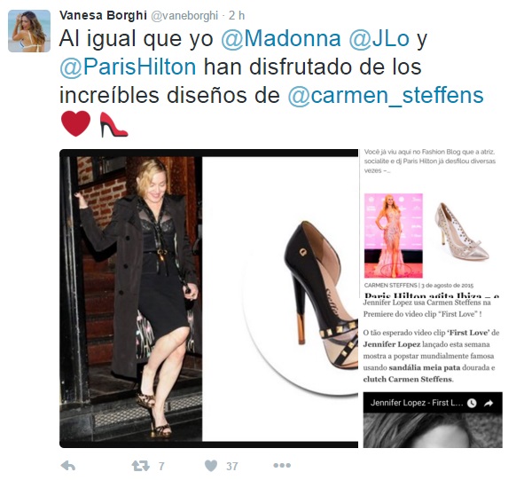 Resulta que la marca de esos zapatos que luce Borghi, y que tienen parte de la suela roja, corresponden a la diseñadora brasilera Carmen Steffens, y no solo la argentina es una fanática de ellos, pues otras celebridades de la talla de Madonna, Jennifer López y Paris Hilton, han lucido en más de una ocasión sus diseños.