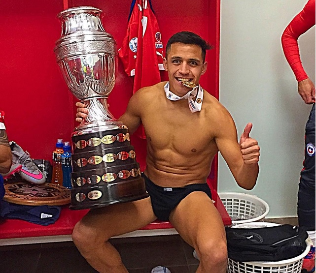 Uno de los que se lució con una foto desde vestuarios fue Alexis, autor del penal que desahogó el grito de triunfo después de 99 años de fracasos. El “Maravilla” posteó una imagen luciendo la copa en paños menores y cómo no, toda su tonificada y marcada figura. Más de 203 mil “me gusta” obtuvo en Instagram.