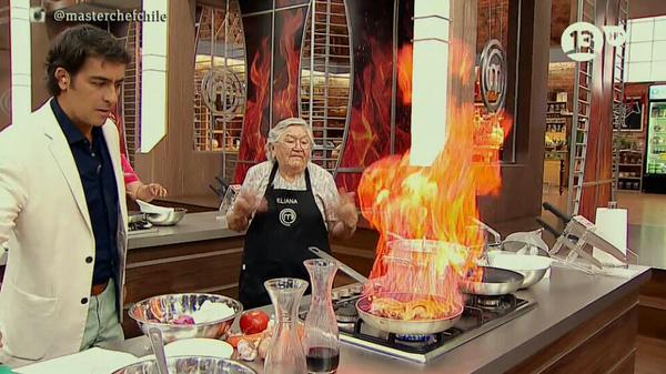 No hay que ser un experto para saber que el alcohol y el fuego no son buenos aliados. Grandes llamaradas a la hora de aplicar el trago en las ollas y sartenes, dieron la cuota de espectacularidad al programa, sin embargo, la abuelita Eliana, con su calma y paciencia, se disponía a echar una gran cantidad de coñac a su pollo, cuando ‘Cris’ Carpentier corrió raudo a ayudarla en esa acción y a advertir que se alejara de la encimera para evitar quemaduras.