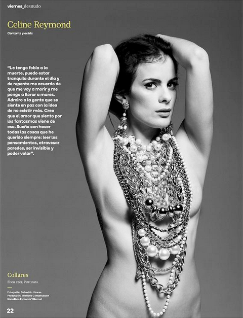 En este contexto la actriz nacional Celine Reymond posó desnuda para la revista Viernes, como parte de una entrevista que realizaron de parte del medio a la intérprete que pronto retornará a la pantalla, informó BioBioChile.