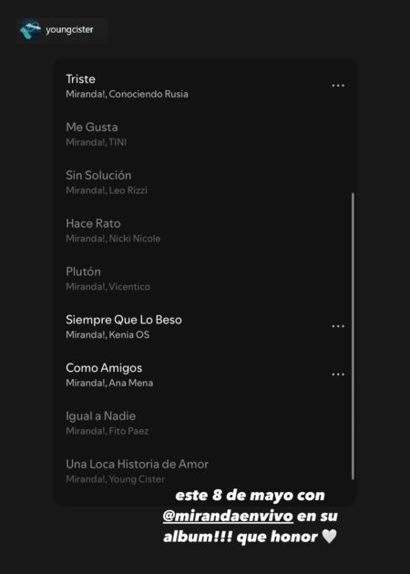 “Este 8 de mayo con Miranda! en su álbum. Qué honor “, fue el mensaje que compartió en su cuenta de Instagram el intérprete de La terapia.
