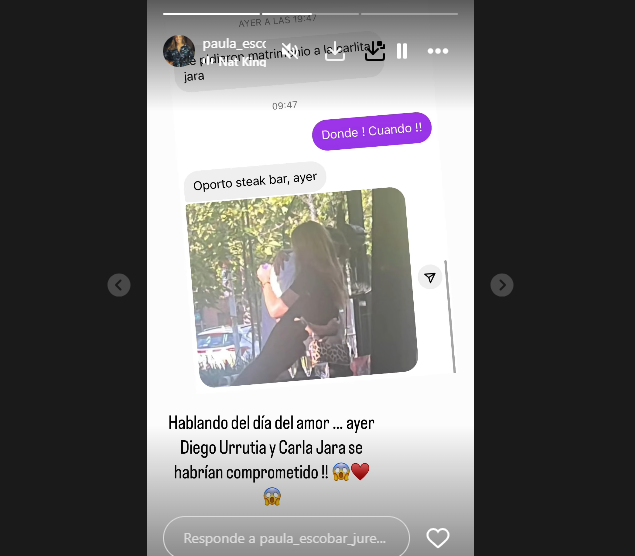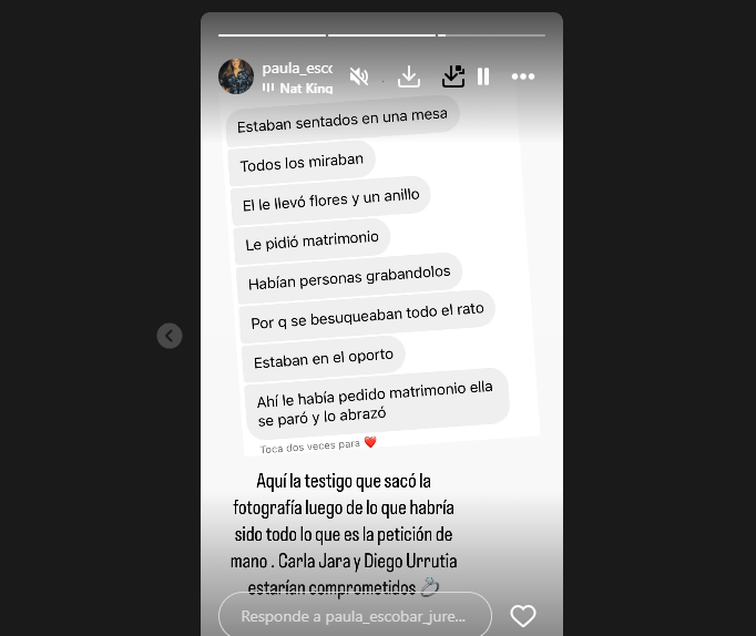 En otra historia, la mujer le dice a Paula que ”ellos (Carla Jara y Diego Urrutia) estaban sentados en una mesa, todos los miraban. Él le llevó flores y un anillo, le pidió matrimonio”.