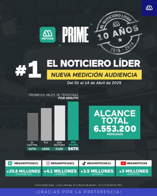 El principal espacio de noticias de Mega supera a su competidor más cercano por más de 60 mil personas promedio por minuto, posicionándose como la principal preferencia de los chilenos a la hora de informarse.