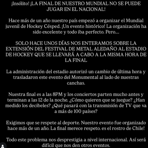 “Con el propósito de asegurar el correcto desarrollo de la final del Mundial Femenino de Hockey Césped, se ha determinado reagendar el recital programado para el sábado 13 de diciembre en el Parque Estadio Nacional”.