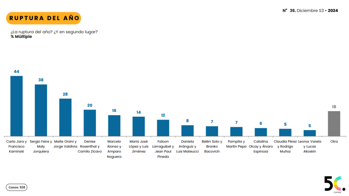 En esta ocasión, los encuestados podían elegir más de una opción, siendo el primer lugar para el quiebre entre Carla Jara y Francisco Kaminski, con un 44%.
