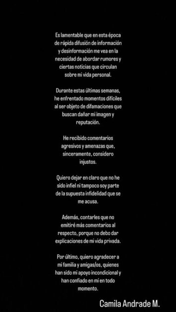 Asimismo, aseguró que no se ha involucrado con alguien con pareja. “Quiero dejar en claro que no he sido infiel ni tampoco soy parte de la supuesta infidelidad que se me acusa. Además, contarles que no emitiré más comentarios al respecto, porque no debo dar explicaciones de mi vida privada”.