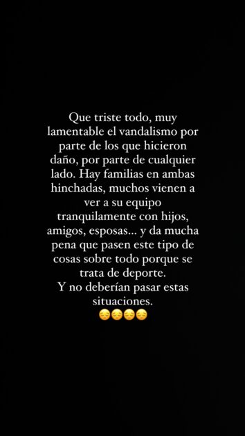 Más tarde, volvió a pronunciarse con un tono distinto. “Qué triste todo, muy lamentablemente el vandalismo por parte de los que hicieron daño, por parte de cualquier lado. Hay familias en ambas hinchadas… Da mucha pena que pasen este tipo de cosas, sobre todo porque se trata de deporte”, expresó.