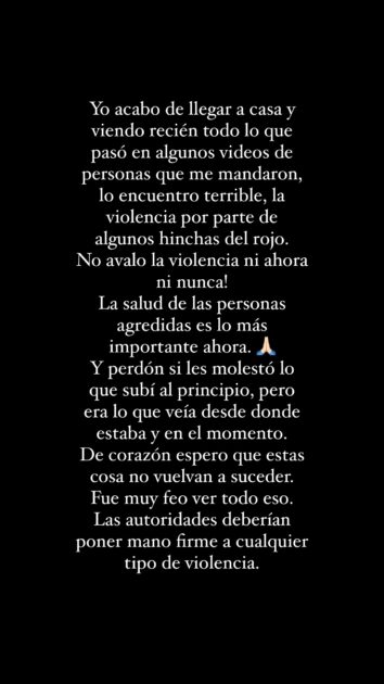 Ya desde su casa, Vallejos decidió ofrecer disculpas por sus primeras declaraciones. “Lo encuentro terrible, la violencia por parte de algunos hinchas del rojo. ¡No avalo la violencia ahora ni nunca! Perdón si les molestó lo que subí al principio, pero era lo que veía desde donde estaba y en el momento”, afirmó.