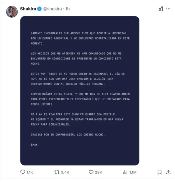 El mismo día de ingreso en la clínica, el parte médico de Shakira comenzó a difundirse en redes sociales , una filtración que la propia entidad condenó en un comunicado oficial.