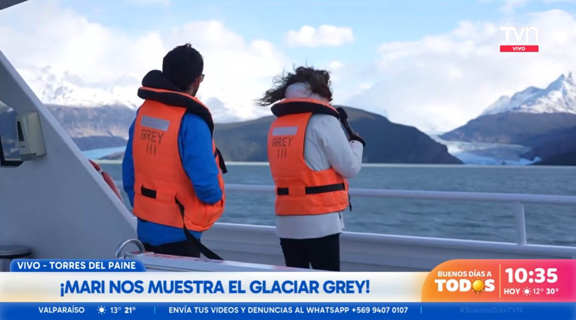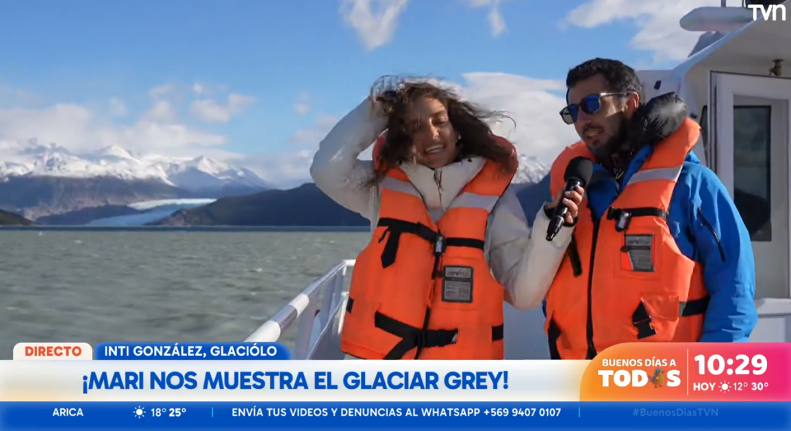 En un despacho transmitido por el matinal de TVN, Godoy conversó con Monserrat Álvarez y Simón Oliveros desde el Glaciar Grey, ubicado en la parte occidental de Torres del Paine.