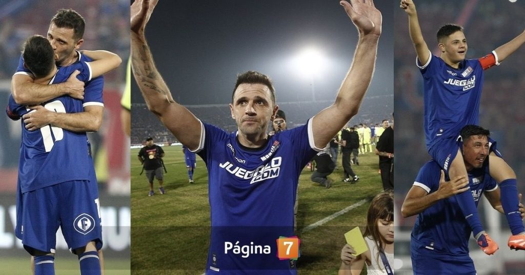 ‘Santi’ celebró sobre los hombros del ‘Palote’ Olivera, en una postal que evocó la época en la que su padre brillaba con la camiseta azul.