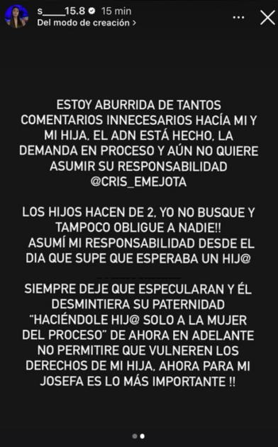 “Los hijos se hacen de a dos. Yo no busqué y tampoco obligué a nadie. Asumí mi responsabilidad desde el día que supe que esperaba un hij@”, escribió Salomé, quien demandó a Cris Mj.