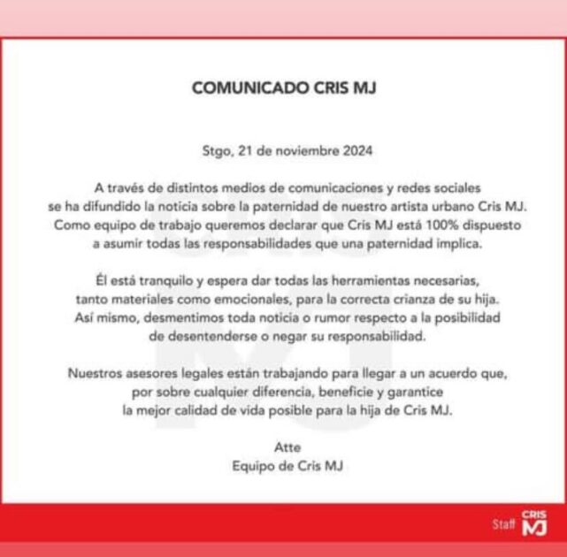 “Como equipo de trabajo queremos declarar que Cris MJ está 100% dispuesto a asumir todas las responsabilidades que una paternidad implica”.