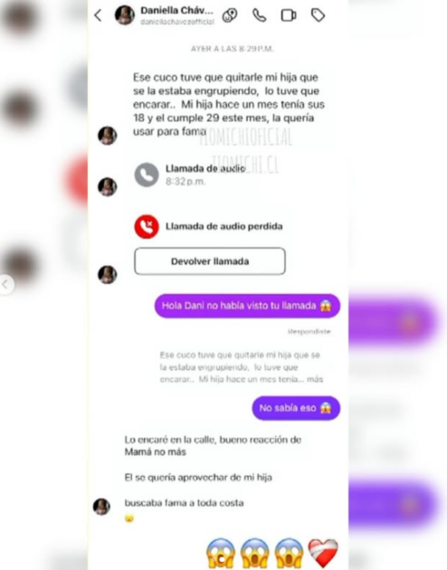 “Ese Cuco tuve que quitarle a mi hija que se la estaba engrupiendo, lo tuve que encarar… Mi hija hace un mes tenía sus 18 y él cumple 29 este mes, la quería usar para fama”, disparó Chávez en el mensaje revelado por Danilo 21.