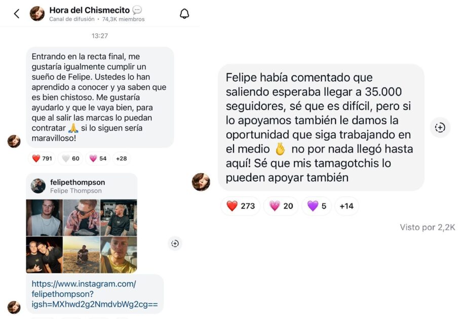 “Él había comentado que, saliendo, esperaba llegar a 35.000 seguidores. Sé que es difícil, pero si lo apoyamos también le damos la oportunidad de que siga trabajando en el medio”.