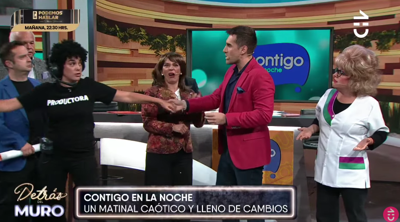 “¡Momento! Se canceló todo. Quedó la cag… en gerencia. Tú, vuelve al matinal (dirigiéndose a Toto), y tú (Jaime), acompáñame. Vuelves al noticiero. Es una orden de gerencia”, lanzó, parodiando el fallido enroque de animadores que estaba programado en Mega.