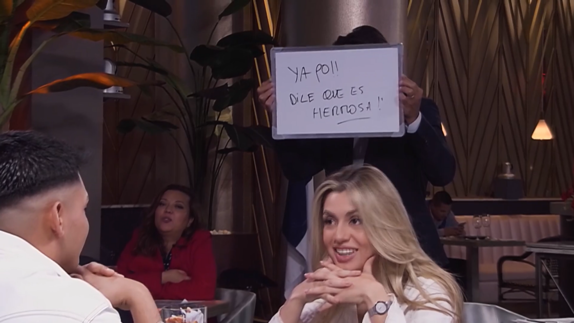 Cuando la joven volvió y se sentó, Cristián Riquelme escribió en un cartel para ayudar al participante de Amor a Ciegas: “Ya po’, dile que es hermosa”.