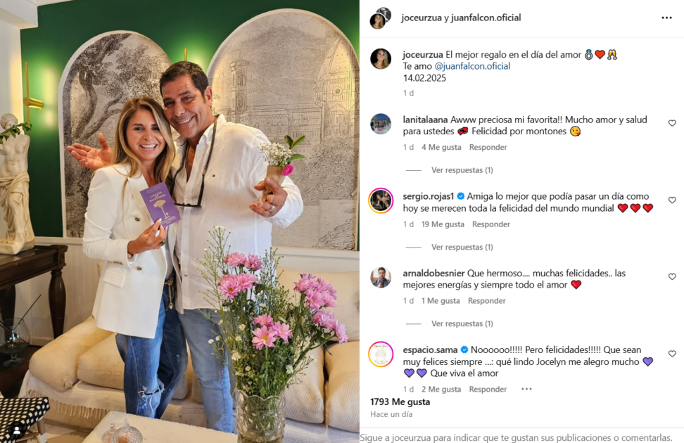 En la publicación, el artista contó que se casó con su pareja. “El mejor regalo en el día del amor”, escribió Juan Falcón junto a la foto en la que aparecen sosteniendo su libreta de matrimonio.