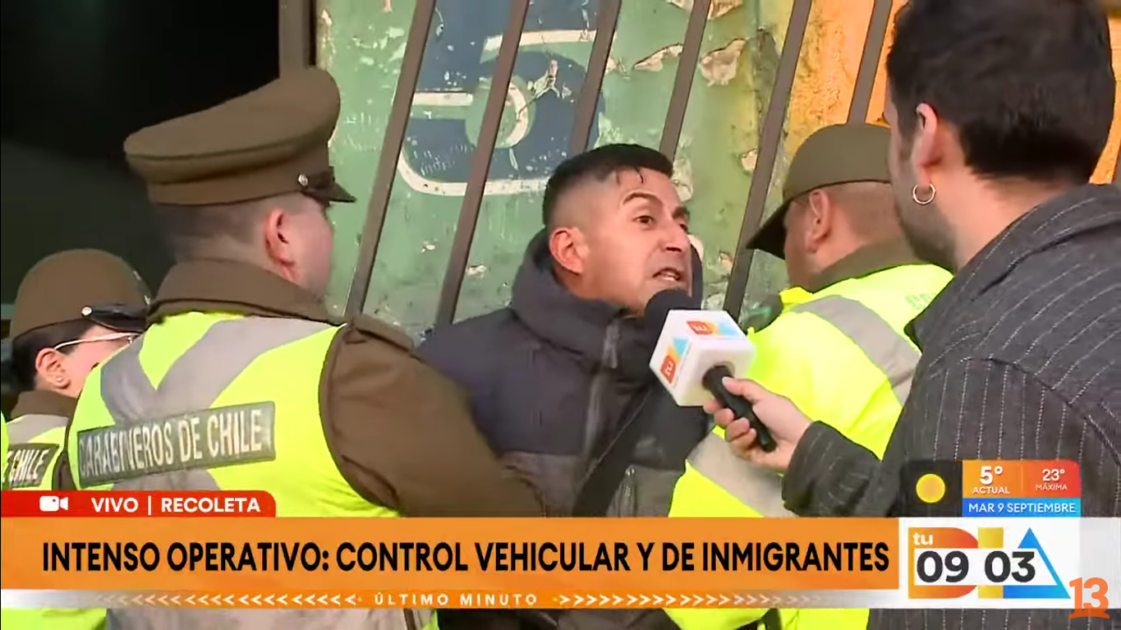 “La situación acá es que la persona, que iba pasando con un carro, dijo ‘esto solo lo hacen para tele’. En ese momento, el carabinero a cargo le pidió su documentación y todo se puso muchísimo más tenso”, relató Gabriel Alegría, notero de Tu Día, durante el despacho.