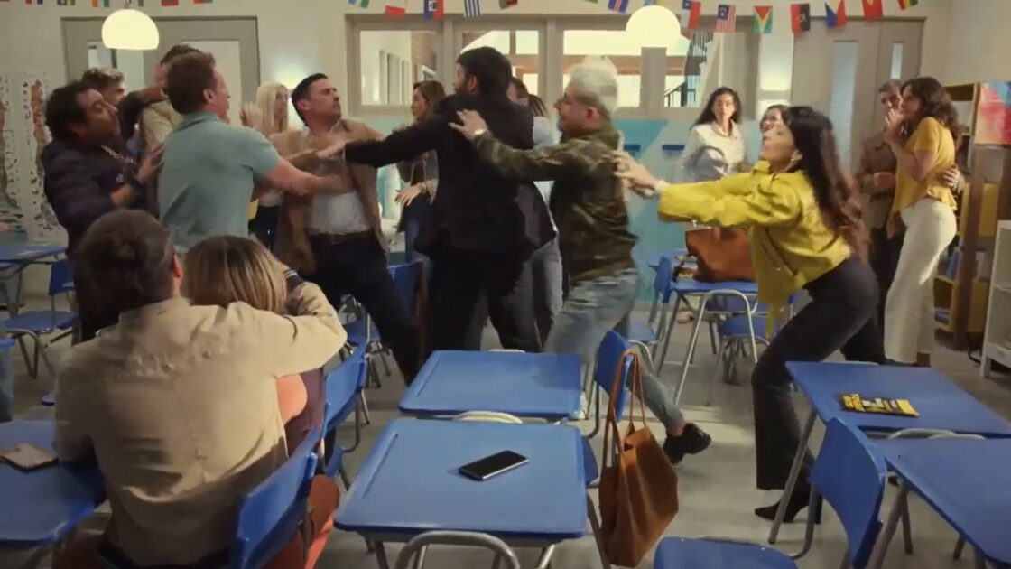 Pero todo indica que pasarán a las manos en medio de una reunión del curso, donde otros padres tendrán que intervenir para separarlos… Un desastre que el profesor jefe le advirtió previamente a Teresa (Elisa Zulueta).