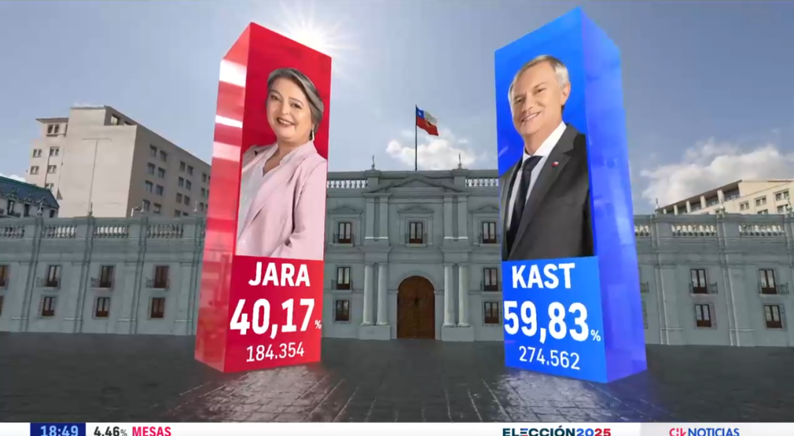 En la imagen se veía que Jeannette Jara obtuvo un total de 59,83% de los votos, correspondientes al 4% de las mesas escrutadas; versus un 40,17% de José Antonio Kast.