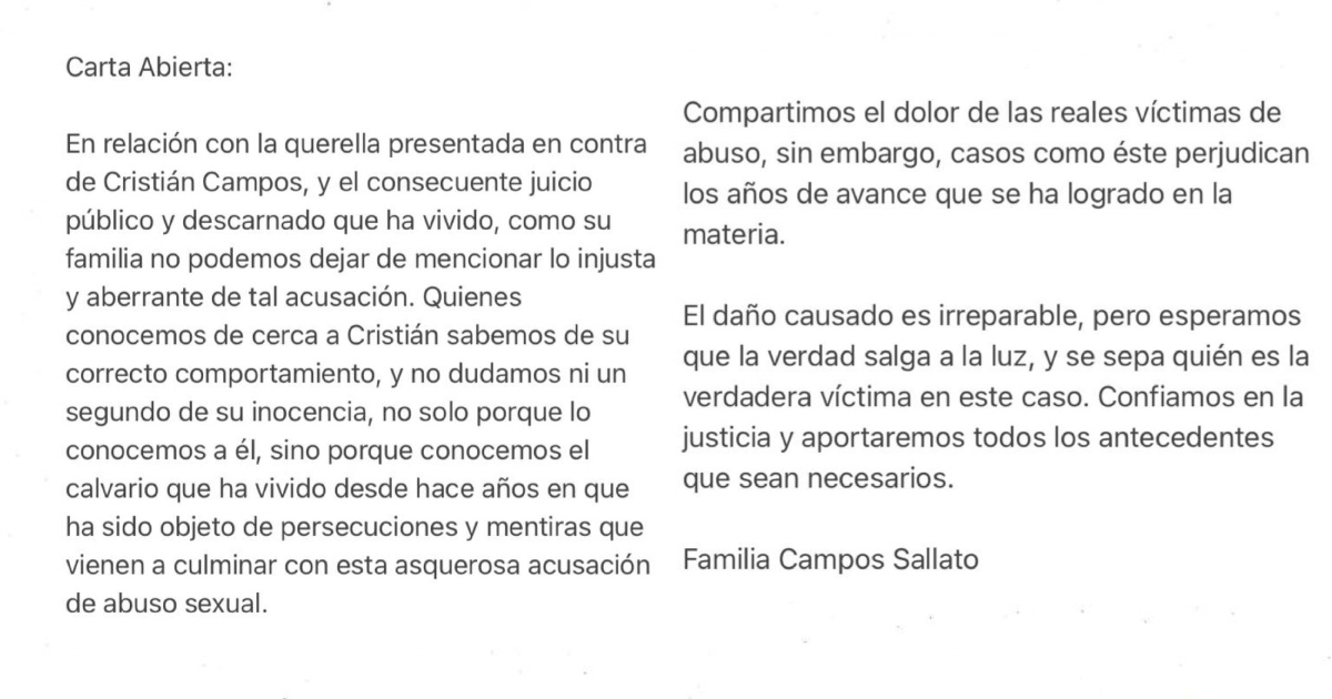 “Compartimos el dolor de las reales víctimas de abuso, sin embargo, casos como este perjudican los años de avance que se han logrado en la materia”, sostuvo la familia de Cristián Campos.