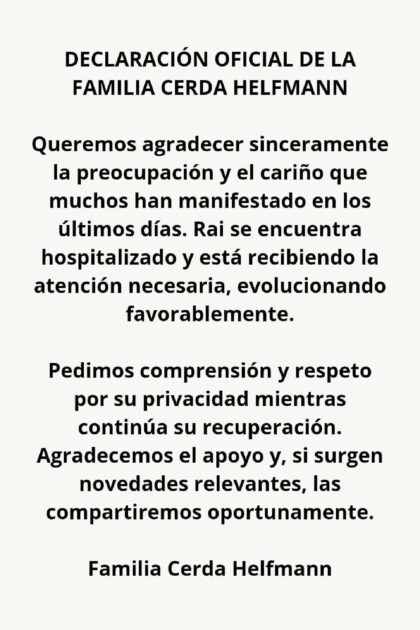 “Rai se encuentra hospitalizado y está recibiendo la atención necesaria, evolucionando favorablemente“.