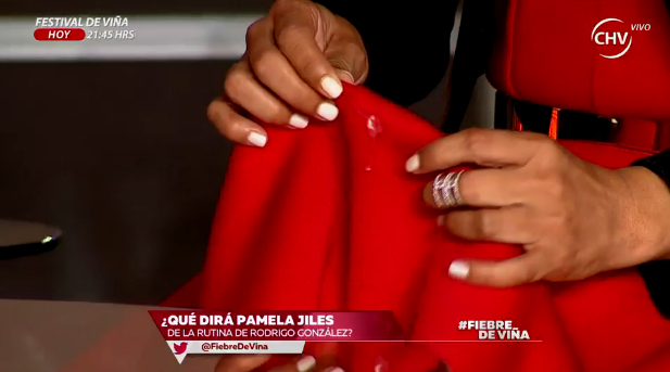 Pero para la animadora de Fiebre de Viña no fue fácil quedarse en pantalla con su vestido manchado, y salió del set para limpiarlo.
