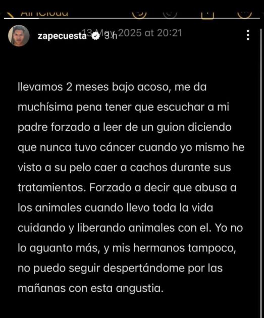 Por otro lado, sobre si su cáncer es real o no, fue su propio hijo quien aseguró: “Me da muchísima pena tener que escuchar a mi padre forzado a leer un guion diciendo que nunca tuvo cáncer cuando yo mismo he visto su pelo caer a cachos durante sus tratamientos”.