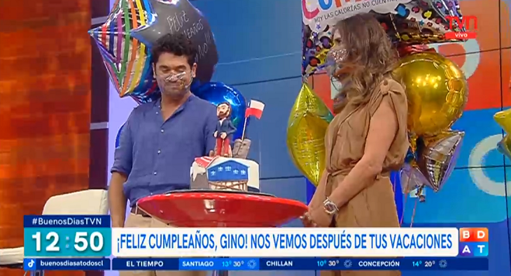Posteriormente, el equipo cantó cumpleaños feliz a Gino con una torta que aseguró “muestra un poco de lo que se me viene”, puesto que el periodista comenzará un nuevo proyecto en Televisión Nacional.