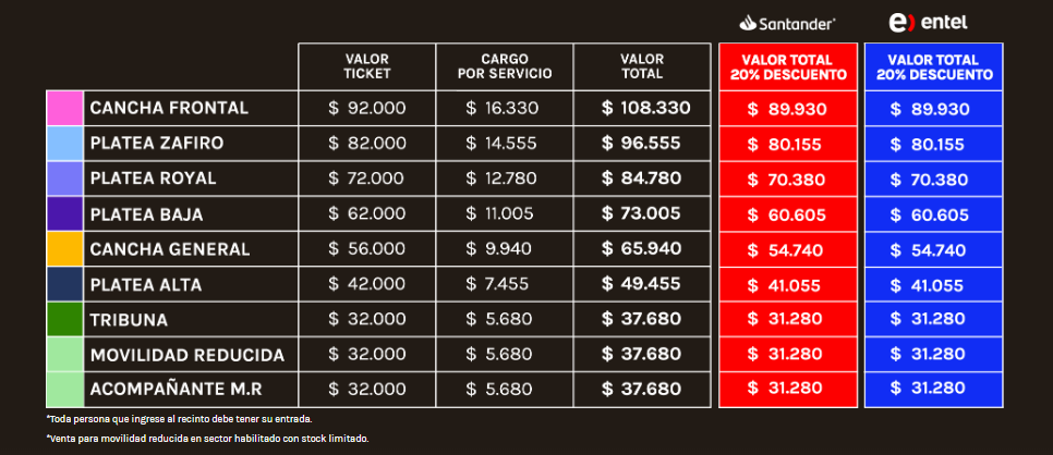 Según la información compartida por la productora, habrá preventa exclusiva para clientes Entel o quienes paguen con tarjeta Santander comenzará el lunes 27 de octubre a las 11:00 horas, donde habrá una rebaja del 20%.