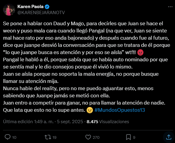 La noche de este jueves, Karen Paola salió en defensa de Juan Pedro Verdier, en sus redes sociales, luego de que Disley Ramos emitiera duras críticas contra él, en el reality Mundos Opuestos.