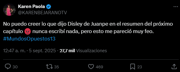“No puedo creer lo que dijo Disley de Juanpe en el resumen del próximo capítulo. Nunca escribí nada, pero esto me pareció muy feo”.