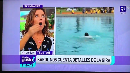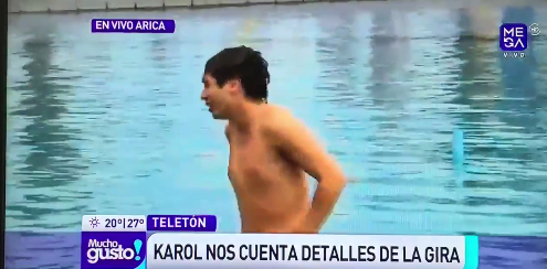 Pero además, le pusieron un desafío: debió lanzarse al agua por la Teletón, así que se sacó la polera, quedó en bóxer y cumplió.