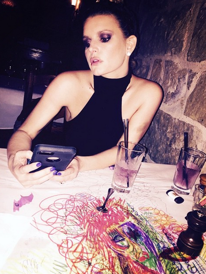 La polémica instantánea fue tomada en un restaurante, donde la artista se puso un vestido negro que resalta sus marcadas clavículas. El maquillaje morado no ayudó a que se viera menos desgastada.