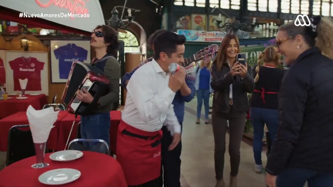 Por si no lo notaste, Rencoret se paseó por el mercado central y grabó con su teléfono a Homero, personaje a cargo de Fernando Godoy, mientras cantaba para atraer clientes al local de Clinton.
