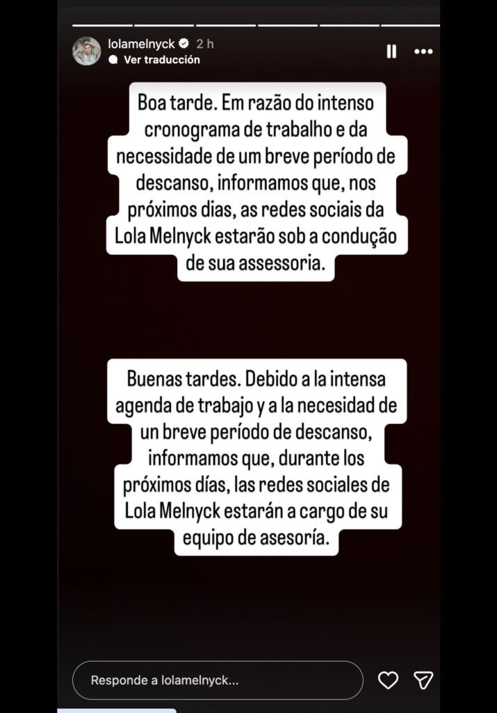 Hasta ahora no existe un comunicado oficial de la propia Melnyck ni de su círculo cercano sobre su estado de salud, pero en sus redes sociales apareció un mensaje indicando que, por motivos de descanso, sus cuentas quedarían a cargo de su equipo.