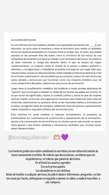 “Los hombres poderosos están cambiando la narrativa y la narrativa está siendo de nuevo sumamente machista . No toleran que denunciemos, no toleran que nos empoderemos, no toleran que ganemos derechos”, escribió.