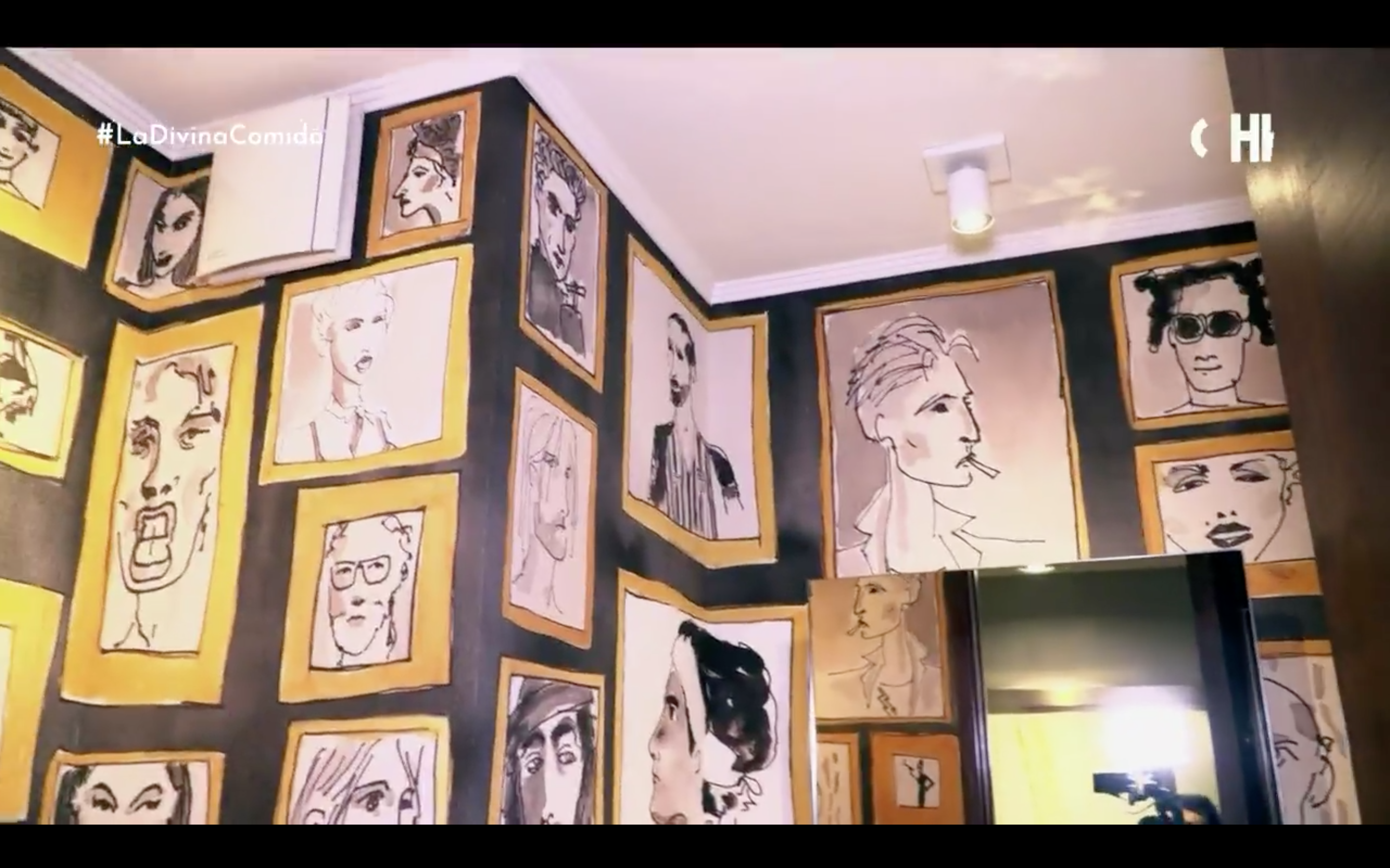 Seguidamente hizo pasar a las cámaras al baño, espacio decorado de techo a piso con artísticos rostros, para posteriormente subir a la azotea, la que aseguró también fue decorada a su gusto y donde se llevó a cabo la comida.