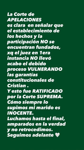 “Y esto fue ratificado por la Corte Suprema. Esto fue una elaboración maquiavélica. Luchamos hasta el final, amparados por la verdad, y no retrocedimos. Seguimos adelante”, cerró.