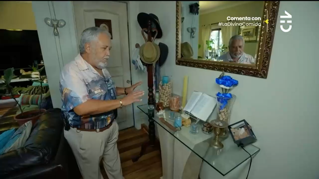 En ese contexto, el concursante abrió las puertas de su hogar. “Cada una de las cosas que están aquí son energía pura y fe, hasta un cáliz tenemos”, partió diciendo.