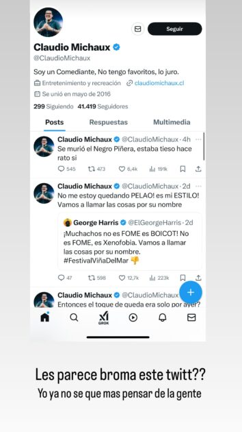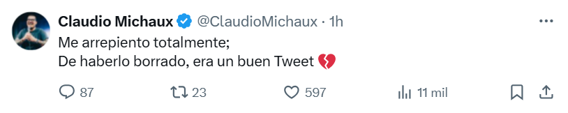A pesar que Claudio Michaux eliminó el tuit, este sábado compartió otro mensaje en el que defiende su humorada.