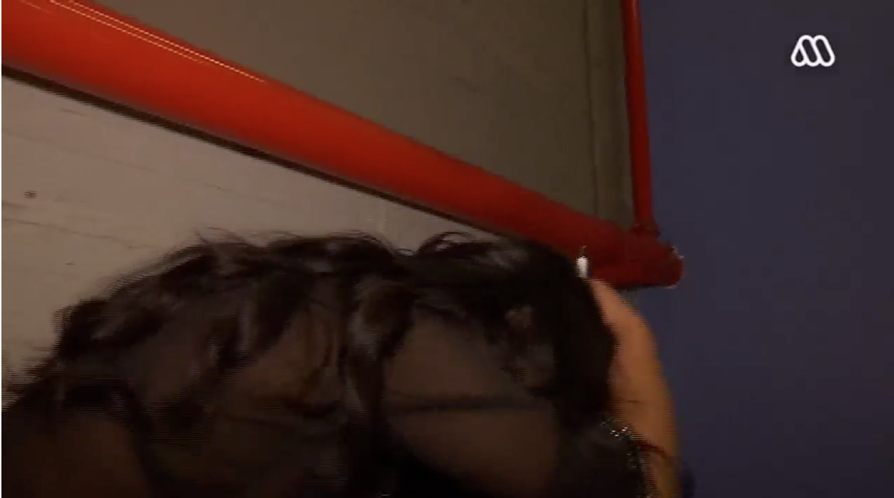 Tras permanecer un tiempo en posición fetal, la mujer levantó la vista riendo. “Me pegué un cabezazo, me pegué un cabezazo con esta hue…”, explicó a Yerko.