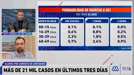 El periodista no se quedó ahí y dijo que “a veces la posición del Colegio Médico, las personas, no la entiende. Porque en el fondo la visión del Colegio Médico choca permanentemente con la realidad. Lo óptimo es que tengamos cero camas UCI, lo óptimo es que tengamos cero COVID, pero lo óptimo no es real, no es posible de conseguir”.