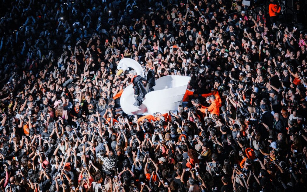 Arriba de un cisne gigante, Juliana Gattas y Ale Sergi sorprendieron a los asistentes, apareciendo desde la cancha del recinto, y “flotando” en un mar de fanáticos.