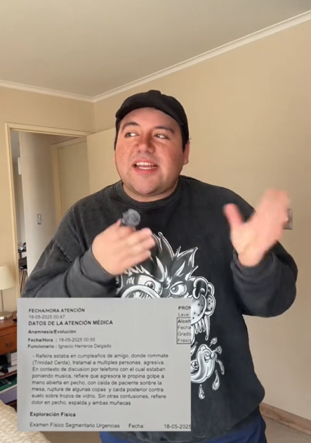 Según un documento expuesto por Danilo 21, la mujer constató a las 00:45 del pasado 18 de mayo. “Refiere que estaba en el cumpleaños de un amigo, donde su rommate (Trinidad Cerda), trata mal a múltiples personas, agresiva”, comentó.