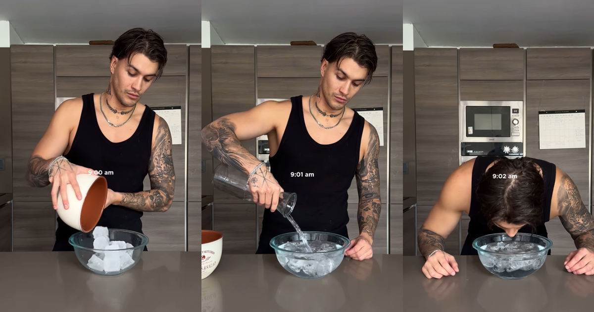 En detalle, se ve al exfutbolista colocando unos cubos de hielo en un recipiente con agua, para luego hundir su cara ahí por algunos minutos.
