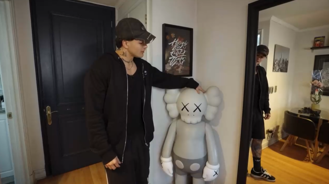 Al entrar en su hogar, lo primero que llamó la atención fue una moderna escultura blanca, conocida como KAWS.