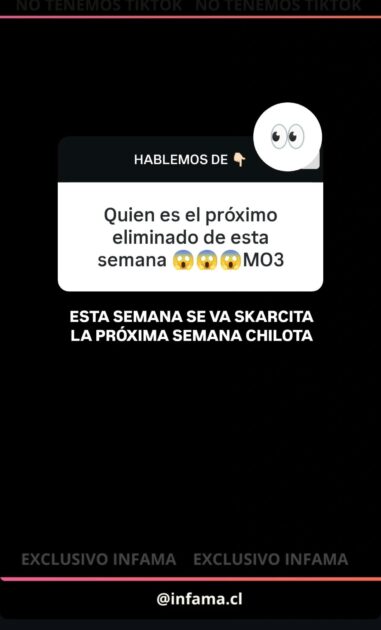 “¿Quién es el próximo eliminado de esta semana en Mundos Opuestos?”, preguntó una seguidora al portal, recibiendo una pronta respuesta: “Esta semana se va Eskarcita, la próxima semana se va Chilota”, aseguraron.