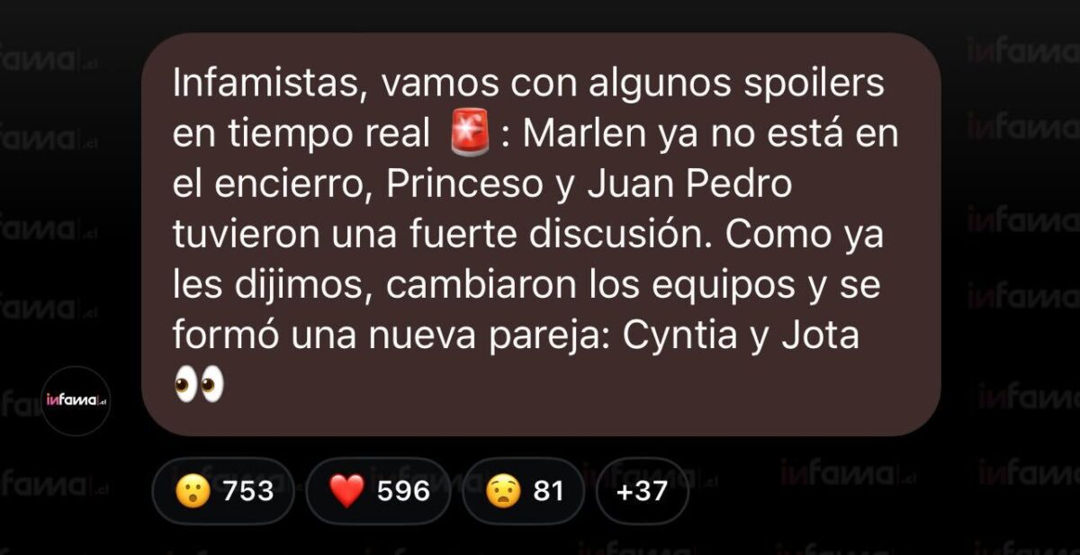 “Vamos con algunos spoilers en tiempo real: Marlen ya no está en el encierro. Juan Pedro y Princeso tuvieron una fuerte discusión”, aseguraron.
